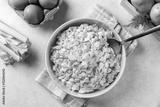 Top view of Potato salad made from boiled potatoes, boiled eggs, onions, celery, mustard, pickle, mayonnaise and paprika dressing. Ingredients on the table.