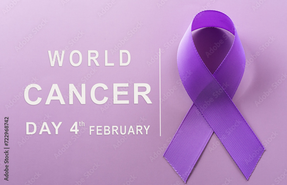 Purple ribbon on pastel paper background for supporting World Cancer Day campaign on February 4.