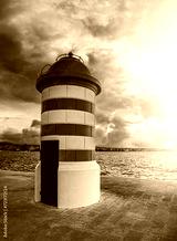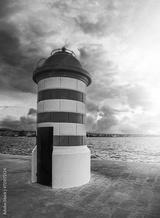 Green striped stone lighthouse in the port. Croatia, Zadar.