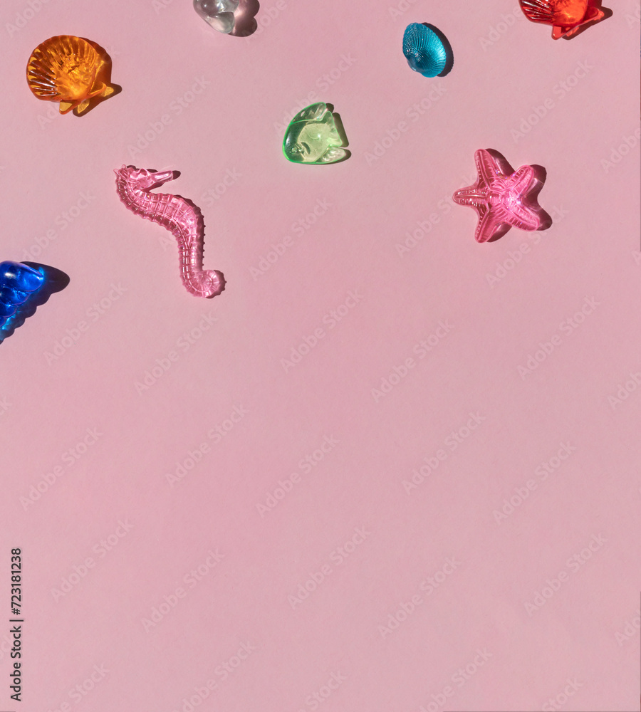 Marine transparent colorful figurines or kid's toys on the pink background. Summer sea vacation concept composition. Copy space