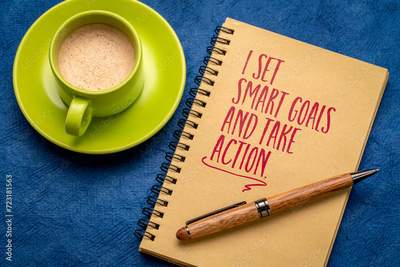 I set smart goals and take action, positive affirmation note in a notebook, goal setting and personal development concept