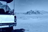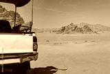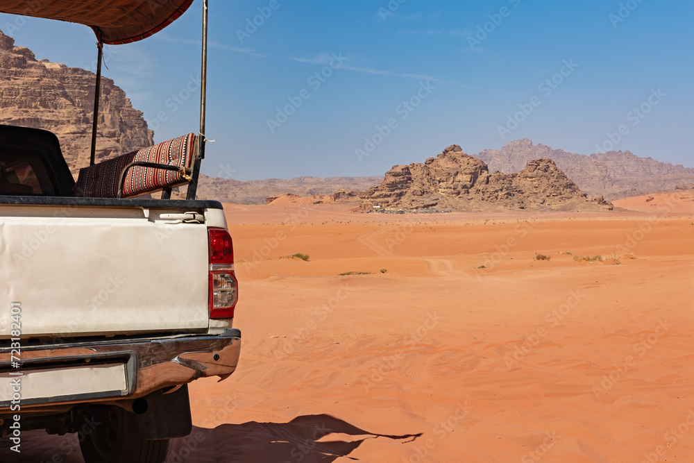 Empty SUV pickup car is ready to drive tourists for a drive through the desert in Wadi Rum. Jordan.