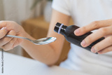 Close up hand of sick woman pouring syrup, liquid antipyretic, cough, flu medicine to stainless spoon from bottle, measuring dosage of drug with tablespoon, taking therapy, treatment cure of disease.
