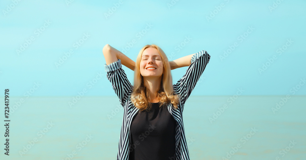 Summer vacation, happy relaxing woman meditates on the beach on sea