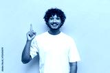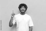 I have an idea. young indian man in white t-shirt raises his finger and points up on yellow isolated background, curly guy knows solution and idea