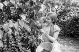 Guatemalan woman cuts coffee beans from a beautiful coffee tree.