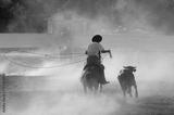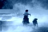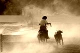 Gaucho lassoing cattle at a dusty rodeo in Rio Grande do Sul, Brazil