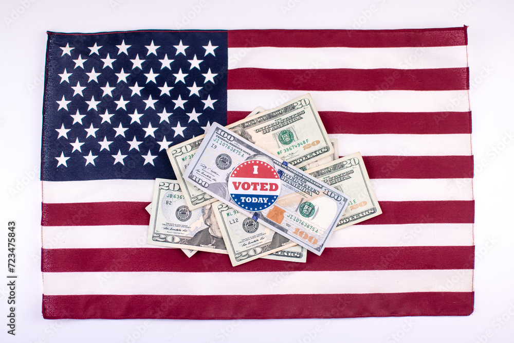 $100 bill with an I voted sticker on a US flag background symbolizing Election fraud.