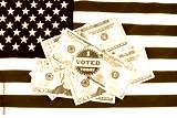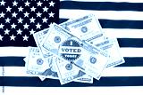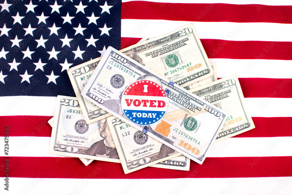 $100 bill with an I voted sticker on a US flag background symbolizing Election fraud.