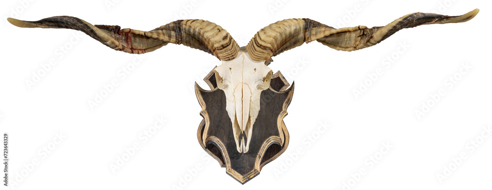 Long horns Racka sheep isolated on white background, Goat Skull and Lamp horns isolated on white background, with clipping path.