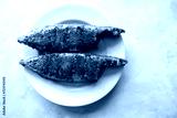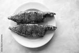 Indian Mackerel fish fry. Bangda Rava fry. whole Fried fish served on a white vintage plate. also known as talalele bangde in Marathi. Copy space.