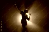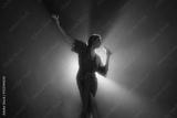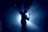 Graceful singer with uplifted arm, bathed in serene blue spotlight on stage against dark background and theatrical smoke. Concept of hobby, festival, concert, disco, music and dance. Ad