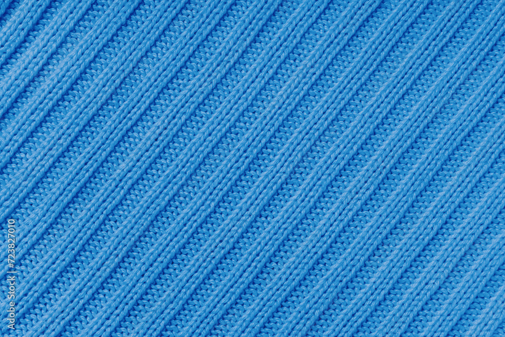 Jersey textile background , blue diagonal striped knitted fabric. Woolen knitwear, sweater, pullover surface texture, textile structure, cloth surface, weaving of knitwear material