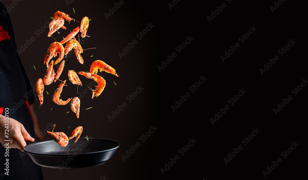 cooking shrimp in pan. Chef cooking prawn on a dark background. copy space for text