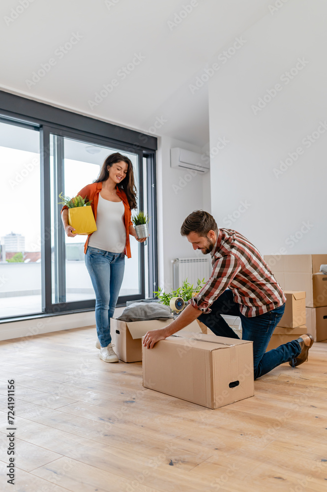 A young couple expecting a baby just moved into an empty apartment unpacking and cleaning. Relocation. New Beginning