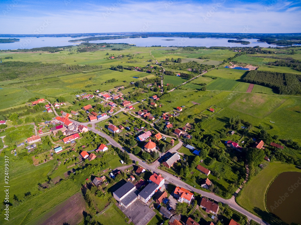 Aerial view of beautiful Radzieje village (former Rosengarten, East Prussia), Mamry, Labap and Dargin lakes in the background, Mazury, Poland