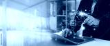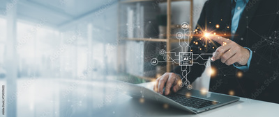 Artificial Intelligence (AI) technology innovation concept, businessman using laptop connecting worldwide internet network, digital learning, cybernetic future, smart science and virtual inspiration.