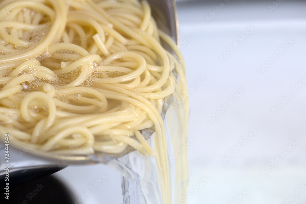 Spaghetti Nudeln Pasta kochen: Wasser aus Topf abgießen