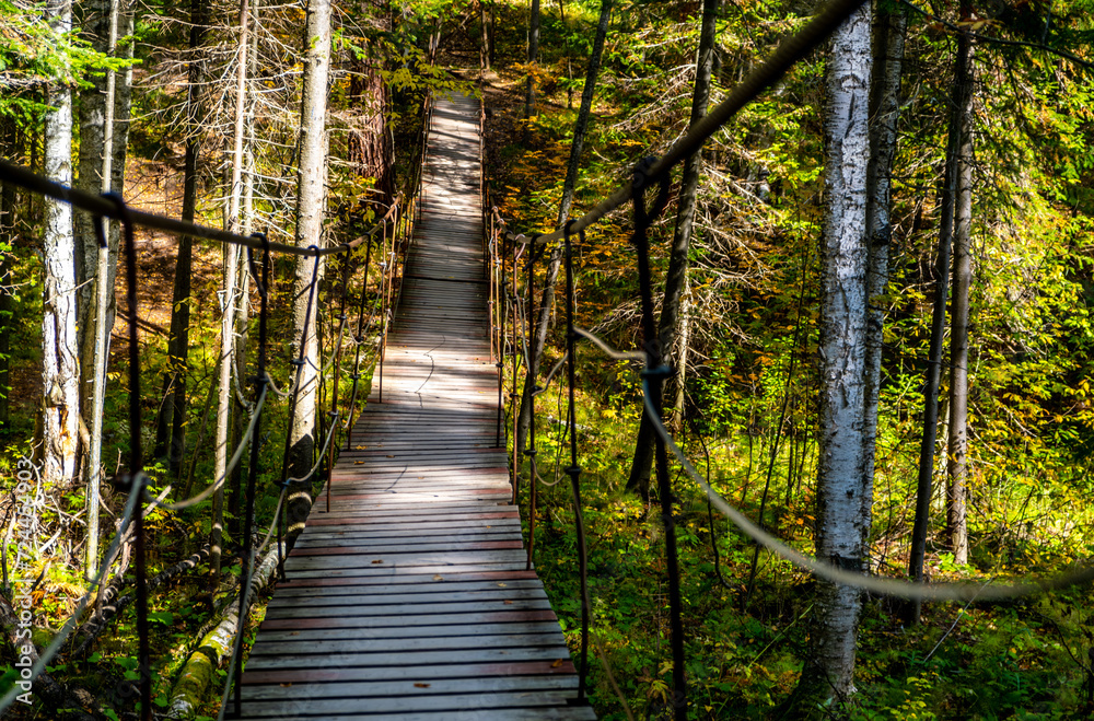 A suspended wooden bridge in the forest on a summer day.