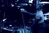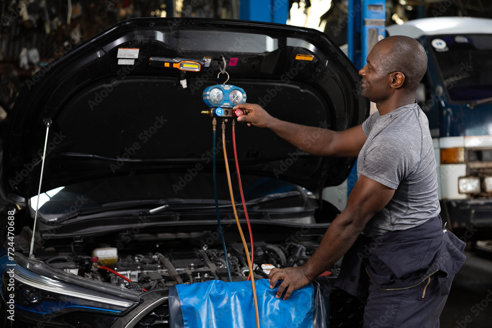 mechanic worker fixing and checking a car air conditioning system in automobile repair shop