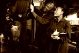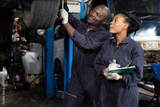 African mechanic workers using lug wrench for fixing a tire in automobile repair shop