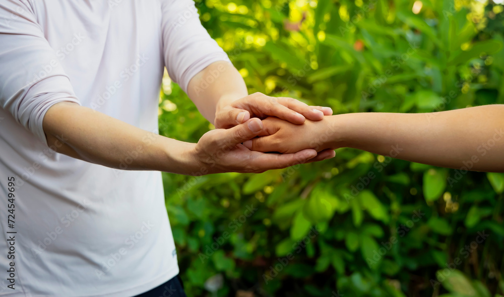 woman hand as lending a helping hand as trust together with compassion concept as lens flare scene at park