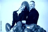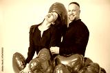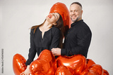 Man and woman holding bunch of heart-shaped red ballons and posing in studio