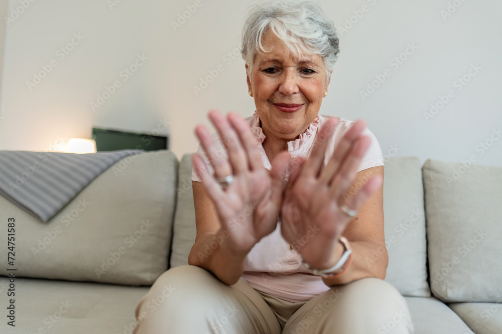 happy senior old hoary woman touching wrist joint, suffering from injured hand. Frustrated stressed middle aged mature female retiree having painful feelings in bones, arthritis osteoporosis concept.
