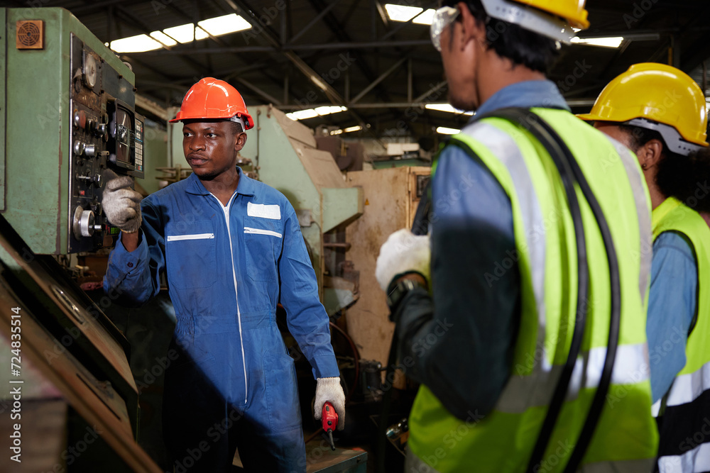 male african foreman training and teaching how to use machine control with workers in factory