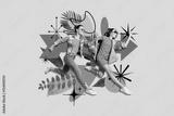 Collage sketch of cheerful funny girl running fast hurrying store isolated on creative background