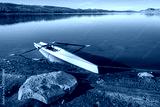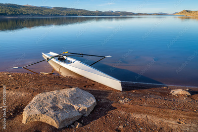 Coastal rowing shell on a shore of Carter Lake in northern Colorado in winter scenery