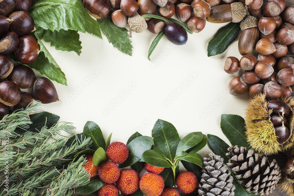 Marco con espacio en blanco y frutos de otoño y Navidad