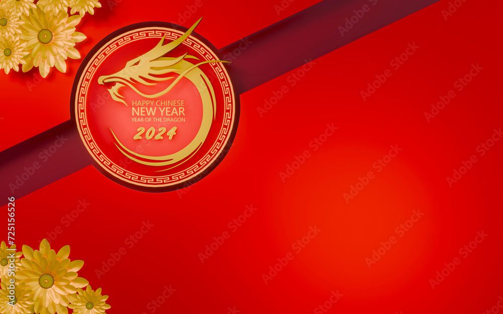 Background image for Chinese New Year 2024. golden dragon and auspicious red. Traditional Chinese gold flower. Writing Happy New Year in Chinese. 3D Rendering.