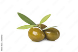 Aceitunas verdes con hojas aisladas sobre fondo blanco