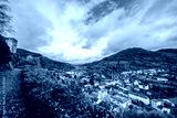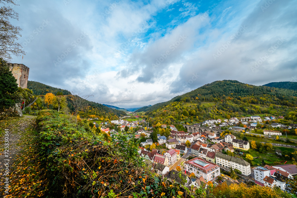 View of the town of Hornberg and the surrounding nature from Hornberg Castle. Landscape with a town in the Black Forest.