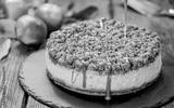 Cheesecake with Caramel Apple on plate, close up, decorated, minimal. Homemade apple cheesecake. For birthday, party, pastry confectionery advert