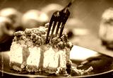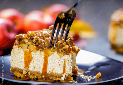 Cheesecake with Caramel Apple on plate, close up, decorated, minimal. Homemade apple cheesecake. For birthday, party, pastry confectionery advert