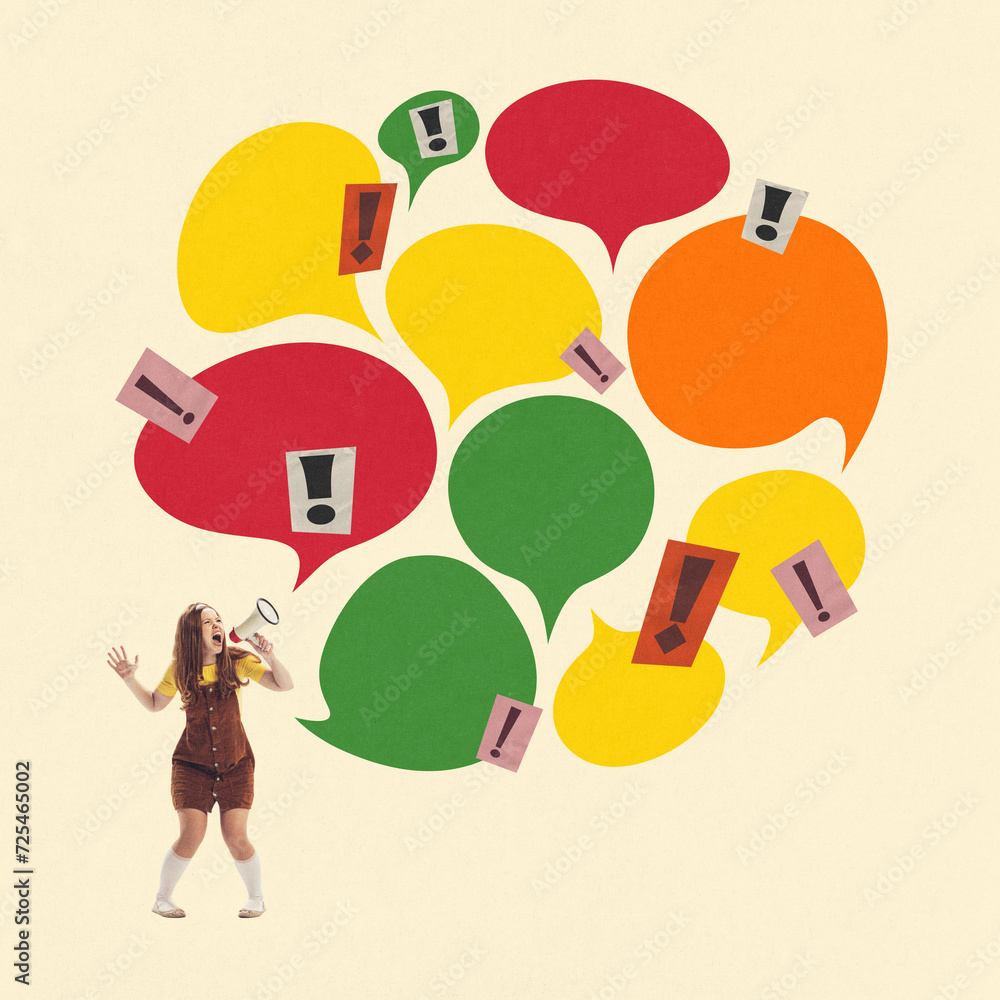 Emotional young girl shouting in megaphone with colorful speech bubbles and exclamation marks around her. Contemporary art collage. Awareness, alertness, spreading important information.