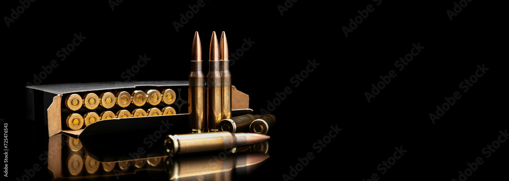 Bullet isolated on black background with reflexion. Rifle bullets close-up on black back. Cartridges for rifle and carbine on a black.