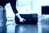 Passenger traveling by plane picking up blue suitcase from conveyor belt in airport arrivals terminal..