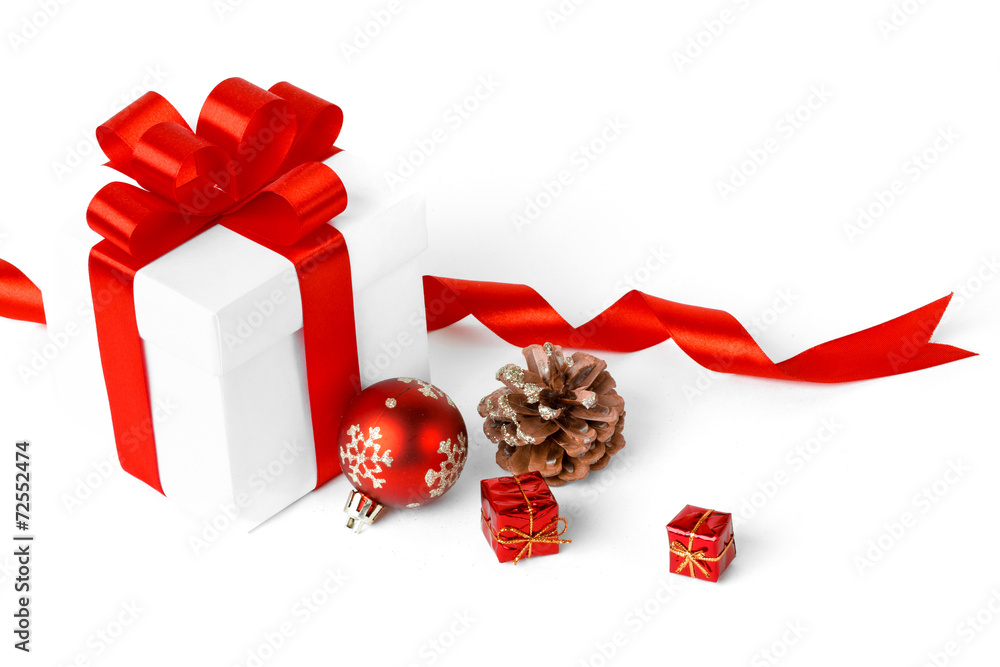 christmas gift with red balls bow