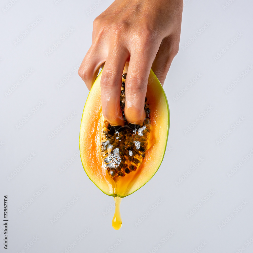 Two female fingers in papaya fruit with a dripping honey. Sex concept.
