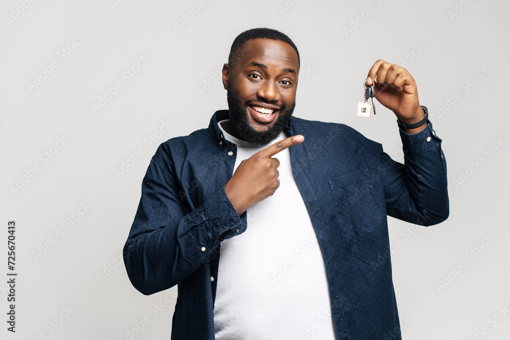 The man points at set of keys, creating perfect setting for themes of selection, decision making, or highlighting important aspects of a product or service. The keys act as a symbol of new beginnings