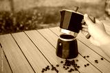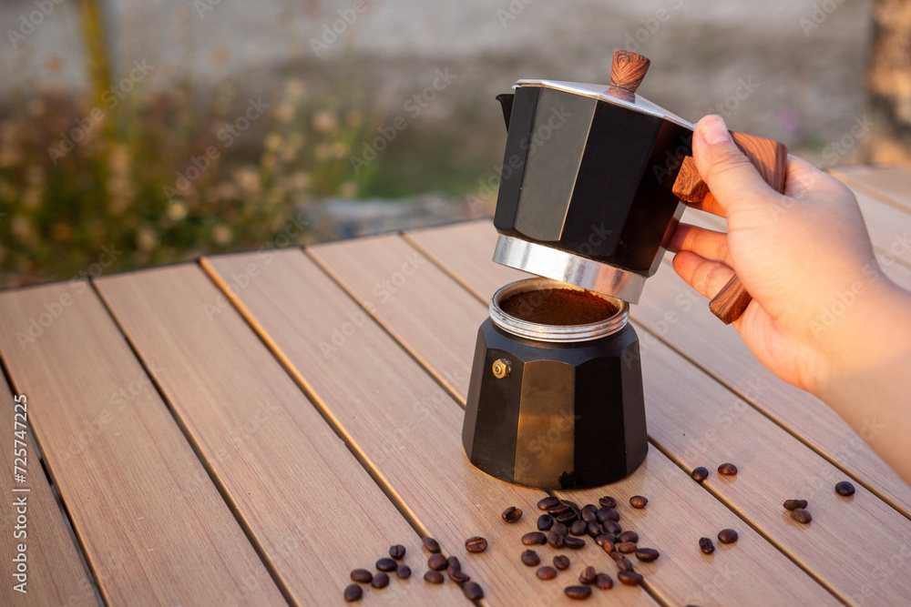 a hand holding handle top pot of moka pot, set against a background of a wooden table with roasted coffee beans