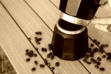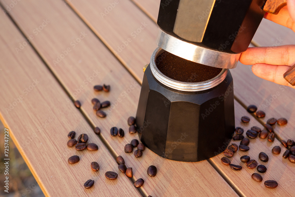 a hand holding handle top pot of moka pot, set against a background of a wooden table with roasted coffee beans