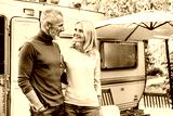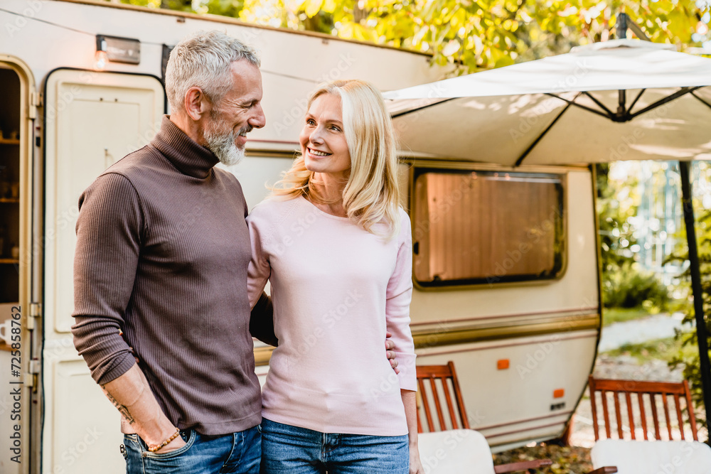 Happy mature caucasian couple looking at each other with passion and love near their caravan home. Traveling together, escaping the urban life by trailer motor home camper van