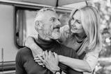 Aged happy european couple hugging and looking at each other with love near their motorhome, traveling together by camper van trailer, caravanning