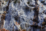 Narrow streams of water run under a thin sheet of ice and over stone