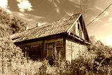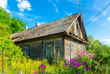 An old abandoned wooden house in the remote countryside in Belarus.