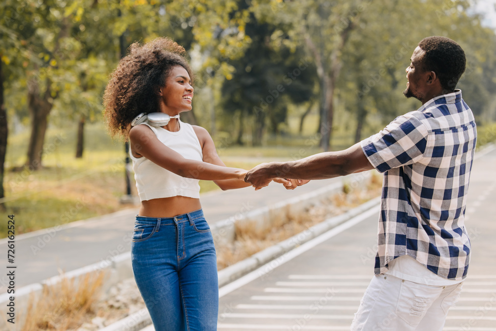 Date couple man and women valentine day. African black lover at park outdoors summer season vintage color tone